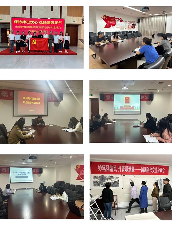 五、结合“三会一课学习”,组织党员深入开展学研讨。研读廉政书籍,认真安排部署教育学习活动,带头讲党性、重品行、作表率,保持对党忠诚,切实提高党建工作水平。举办“学党纪党规 守退休红线”书记讲堂学习活动、“妙笔扬清风 丹青颂清廉”-国画创作交流分享会、“保持律己忱心 弘扬清风正气”-美术馆党支部与金控集团第四党支部廉政共建活动等,增强全面从严治党的政治自觉、思想自觉和行动自觉。